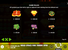 O símbolo mais bem remunerado é o dragão e aterrissando três dragões na linha de vitórias oferecem um pagamento de 50 para uma aposta. Os 88 números da sorte são o próximo ícone de pagamento alto e oferecem 0 por acertar três 88 consecutivos na linha de pagamento ativa. Os símbolos com baixos salários são as barras de fogos de artifício single, duplo e triplo chinês.