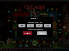 A grade do carretel 5 × 3 terá luzes de Natal decoradas. Isso ocorre porque o filme em si se passa nos feriados. Os rolos giram à medida que as luzes pisam dentro e fora. No fundo, você pode ouvir a risada travessa dos temidos Gremlins escondidos na sala. Existem 20 linhas de pagamento para vencer, com estes sendo fixos e incapazes de mudar. Abaixo da grade estarão seus botões. Aqui você pode girar os rolos, definir sua aposta atual e acessar o menu para obter mais informações sobre bônus. Você também pode definir o jogo no giro automático para girar automaticamente as bobinas.