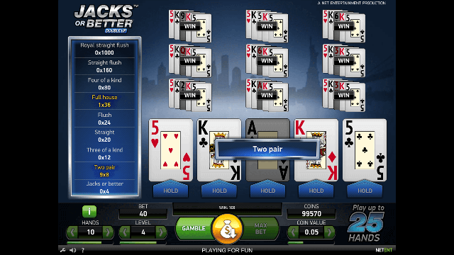 Jacks ou melhor ou desenho de poker é o jogo de video-video de vídeo mais popular, amplamente jogado nos estabelecimentos de jogos eletrônicos do Portugal Real Money. Diversos desenvolvedores de software de cassino experimentaram o videopoker, o que resultou na produção de dezenas de variações do mesmo jogo. Ao contrário das máquinas caça-níqueis que são basicamente orientadas para a sorte, a menos que existam alguns recursos baseados em habilidades incluídos, o poker é amplamente baseado na habilidade. Isso não muda com a versão em vídeo e certamente não muda neste título, o assunto desta revisão.
