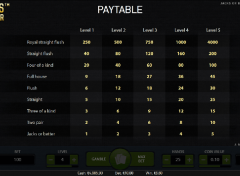 Se você deseja ganhar muito em suas apostas, este jogo de cassino estará entre seus favoritos. Os pagamentos são cuidadosamente dispostos no painel à esquerda da tela. Alterar seus níveis de aposta também altera os pagamentos. E você pode ajustar suas apostas em cada nível. O Royal Straight Flush oferece o maior pagamento, vale até x250 da sua participação.