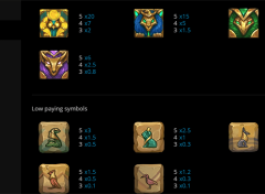 A Snake está no topo da lista de símbolos de baixo pagamento, onde pode premiar 3x a aposta no máximo. Lion Awards 2.5 e Dog 2x A estaca por cinco do tipo. De tudo, Ibis e Kestrel são os símbolos mais baixos e quando cinco do tipo aparecem em uma linha de pagamento, eles oferecem 1,5x e 1,2x, respectivamente.