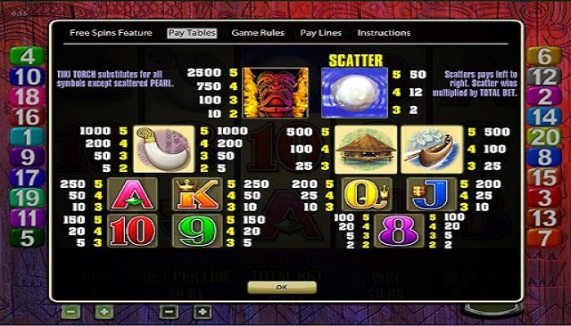 Neste jogo, o símbolo principal de jogo ou o símbolo da tocha tiki se comporta como a natureza do jogo. Pode ocorrer todos os outros símbolos além da dispersão ou do símbolo de pérolas para formar combinações vencedoras. O símbolo de dispersão paga da esquerda para a direita e as vitórias de dispersão são multiplicadas pelo valor total da aposta. O símbolo mais bem remunerado é o selvagem, seguido pela faca, Hut5 e canoa. Os símbolos regulares são constituídos por A, K, Q e J, 8, 9 e 10.