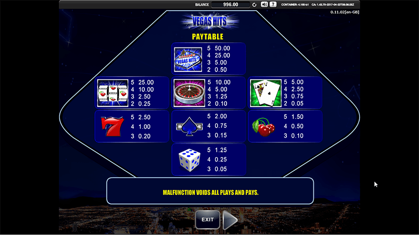 Uma das coisas mais impressionantes sobre esse título é que ele tem as várias imagens de jogos de cassino como os símbolos nos rolos. O ícone mais bem remunerado é o logotipo, e o pouso de 5 deles nos rolos oferece um pagamento de 5000 moedas para a participação máxima. Os ícones do caça -níqueis do cassino, como rolos de caça -níqueis, Lucky 7, e cerejas são símbolos aqui. Você pode encontrar a Roleta, Jack and Ace, Spade com barra e dados como ícones. A Paytable é a seguinte.