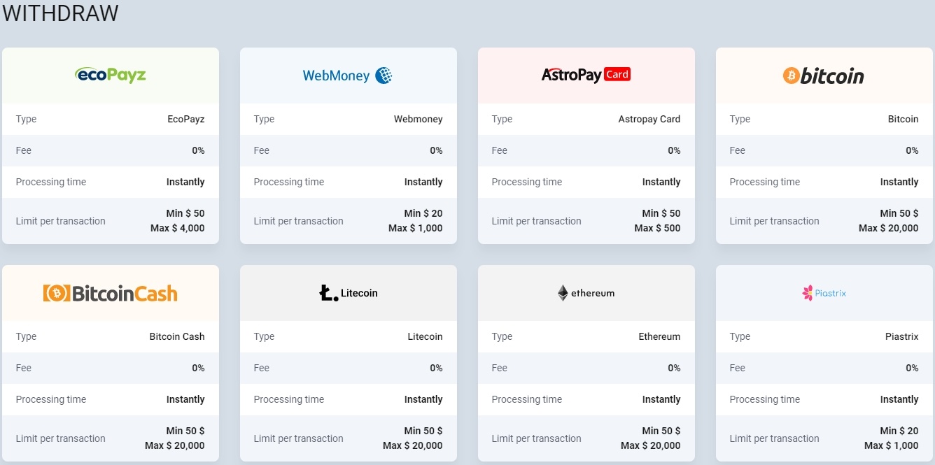 A retirada funciona muito semelhante aos métodos de depósito. Você pode selecionar entre os mesmos métodos que antes, além do Neosurf, pois eles não aceitam saques. Cada um deles terá um limite de retirada, com as criptomoedas tendo as mesmas. Não há cobrança extra para nenhum dos métodos de retirada, no entanto, há um período de espera para o visto de cartão de débito. Isso levará até três dias úteis ou menos. Pode ser necessária uma identificação adicional antes que você possa retirar seu dinheiro. Isso pode ser apenas uma prova simples de identidade.