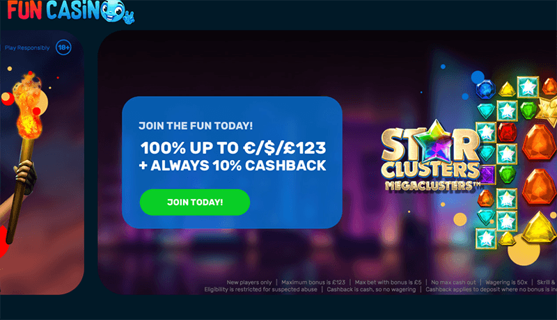 Cassino divertido, como a maioria dos outros sites de apostas, usa bônus e promoções atrair jogadores para testar seus jogos em dinheiro real. As ofertas começam com um bônus divertido de cassino sem depósito de onze giros gratuitos, o que é concedido após o login da primeira conta, mas antes de um depósito de dinheiro real.