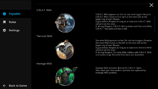 - Terrorista selvagem: Aparece no quinto rolo e premia um re-spins. A cada re-rotação, ele move o próximo carretel à esquerda. Quando Swat e Wilds terroristas se encontram no meio, eles "lutam". Se Swat vencer a luta, você recebe 3 rodadas grátis. Nesse modo, cinco ícones aleatórios são substituídos por "reféns selvagens" após cada spin. Se os terroristas vencem, você recebe 10 rodadas gratuitas com o recurso "Bomb Wild".