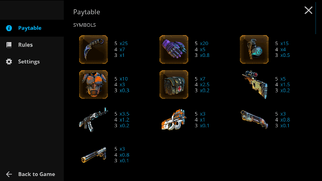 Os símbolos do slot redondo da ás são inspirados no tema do jogo de tiro. Eles consistem em imagens de armas e equipamentos táticos. Há um total de quatorze símbolos a serem usados, e seu objetivo é pousar um ao lado do outro em uma linha de aposta, pelo menos três símbolos correspondentes lado a lado. Você pode ganhar entre 0,1 e 25 moedas, com base no tipo e número de símbolos.