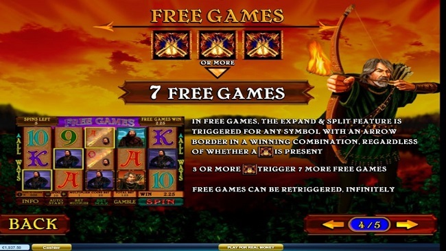 - O pouso de três ou mais símbolos de arco e flecha o recompensará com 7 rotações livres extras. Você pode re-acioná-los para mais rodadas durante essas rodadas de bônus.