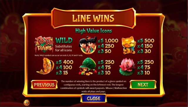 O ícone de gato de ouro é um símbolo de alto pagamento. Paga 2,500 moedas incríveis quando aparece cinco vezes em um carretel. O próximo logotipo que paga muito no slot de gêmeos FA-FA é o símbolo de peixe Koi, dando a você até 2.000 moedas quando você consegue encontrar cinco delas na tela. Outros ícones bem remunerados incluem a flor de lótus e o símbolo de moedas que pagam até 1.250 moedas sempre que cinco delas aparecem na tela do jogo.
