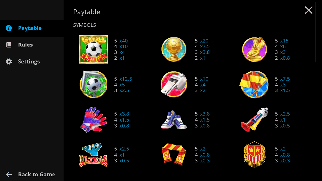 Os três personagens mais bem remunerados também concedem combinações de dois símbolos e são valorizados entre 0,8 e 1 crédito. Esses pagamentos são concedidos de acordo com o valor da BET usado durante a jogabilidade, que pode estar entre 0,1 e 500 créditos. Nenhuma habilidade é aplicável durante a demonstração gratuita do futebol ou a jogabilidade em dinheiro, com a única outra etapa girando os rolos manualmente ou usando a função AutoPlay. Durante a jogabilidade, os apostadores exploram uma taxa de RTP de 94% e baixa a média variação.