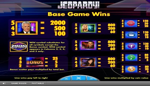 Alex Trebek (o anfitrião do programa) é o símbolo mais bem remunerado, onde se você tiver a sorte de chegar a cinco, receberá até 2.000 moedas. Os outros símbolos também têm recompensas impressionantes, com as menos 60 moedas por três símbolos nos rolos.