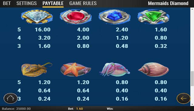 | O símbolo mais bem remunerado é o diamante. Ele mantém o poder inexplorado e ganhará propriedades especiais durante as rodadas livres. A sereia não tem pagamento e apenas atua como a natureza. | O diamante da sereia: 100 - 1000 |