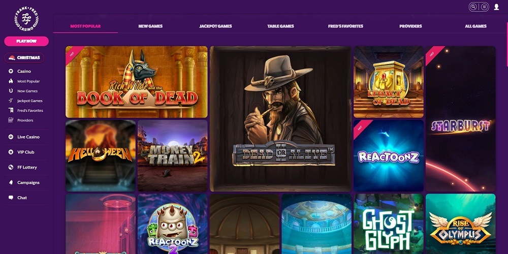 Se você é fã dos slots modernos com muitos temas diferentes, opções de bobina, linhas de pagamento e recursos exclusivos, não precisa procurar em nenhum outro lugar que não seja a seção Slots Frank & Fred. É um tesouro para slots e você pode encontrar mais de 8000 títulos aqui. Os vários títulos populares incluem:
